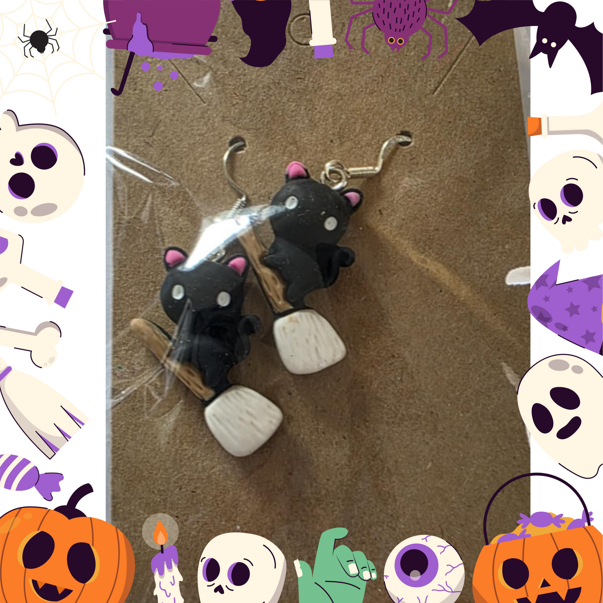 Black Cat Riding Broom Earrings (Clay)
